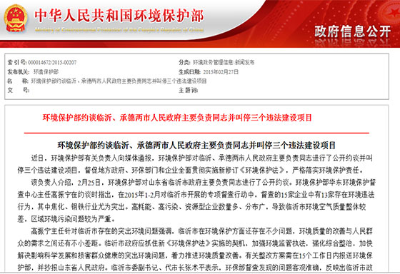 環(huán)保部刊發(fā)約談臨沂市長原文:《環(huán)境保護(hù)部約談臨沂、承德兩市人民政府主要負(fù)責(zé)同志并叫停三個違法建設(shè)項(xiàng)目》