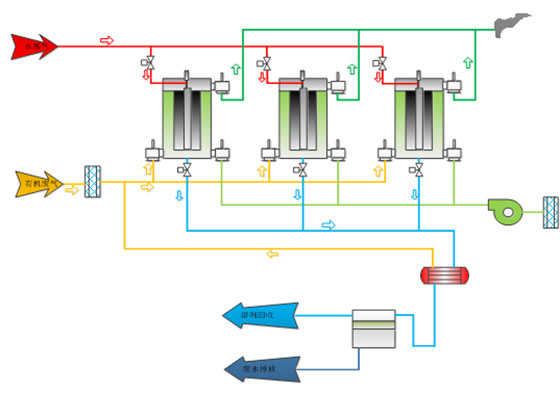 ??????? 由于從車間排放的有機(jī)廢氣是經(jīng)過渦輪膨脹機(jī)組排出,所以排出的廢氣首先經(jīng)過粗效過濾器過濾廢氣中的粉塵或雜質(zhì),然后直接進(jìn)入到活性炭纖維吸附裝置進(jìn)行有機(jī)廢氣吸附,經(jīng)過吸附后的廢氣可以直接達(dá)標(biāo)排放;吸附飽和后的活性炭纖維經(jīng)水蒸氣脫附并且冷凝后,回收的有機(jī)溶劑可以循環(huán)再利用,廢水則進(jìn)行集中處理后排放。