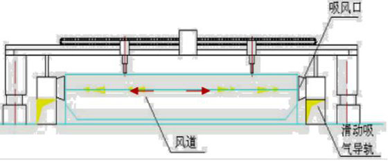 在切割平臺兩側(cè)安裝方形吸風(fēng)道,吸風(fēng)道上方裝有一個(gè)可隨切割機(jī)一起移動(dòng)的滑動(dòng)吸風(fēng)小車(每個(gè)切割機(jī)兩個(gè))?;瑒?dòng)吸風(fēng)小車、切割頭、安裝在切割機(jī)沿橫梁方向的同一直線上。利用切割平臺上的格柵板與被切割鋼板形成煙氣通道,切割鋼板時(shí),產(chǎn)生的切割煙塵通過該煙氣通道由風(fēng)機(jī)負(fù)壓作用流向滑動(dòng)小車吸風(fēng)口,進(jìn)入方形吸風(fēng)道,最后進(jìn)入凈化器主機(jī)進(jìn)行切割煙塵凈化處理。