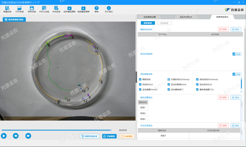 昆蟲行為分析系統(tǒng)是由昆蟲行為分析系統(tǒng)軟件、專用筆記本電腦、高清高幀工業(yè)相機組成。使用專用軟件對錄制的昆蟲活動視頻或傳入實時昆蟲觀測視頻流進行分析,識別并跟蹤目標(biāo)昆蟲,獲取昆蟲隨時間變化的(X,Y)坐標(biāo),同時記錄輸出十余種昆蟲運動相關(guān)參數(shù),記錄運動軌跡圖,實現(xiàn)昆蟲運動可視化分析,輔助昆蟲行為研究。