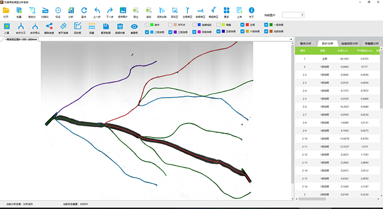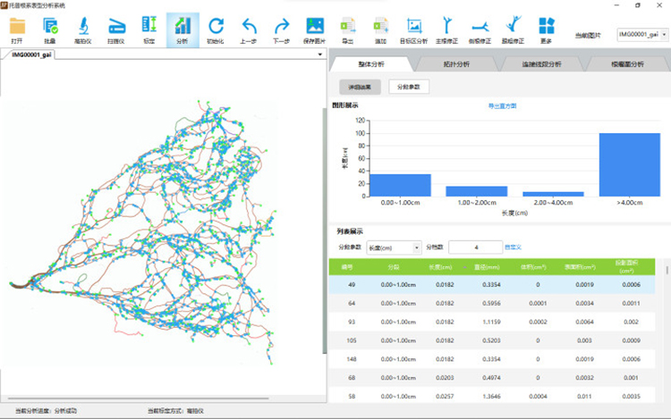 一鍵分析多項(xiàng)參數(shù):一鍵操作,精準(zhǔn)獲取根總數(shù)、根尖數(shù)量、根總長、根平均直徑、根總投影面積、根總體積、R/G/B、RHS、總連接點(diǎn)數(shù)、端點(diǎn)、關(guān)節(jié)點(diǎn)、連接點(diǎn)數(shù)、分叉數(shù)、交疊數(shù)、盒維數(shù)等多項(xiàng)參數(shù);